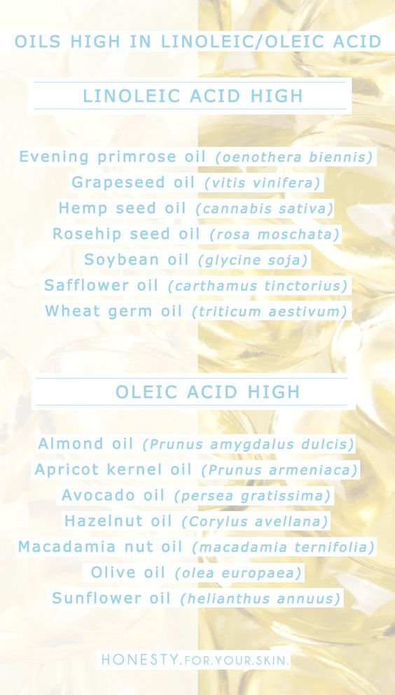 Nếu da bạn là da dầu và gặp các vấn đề mà da dầu hay gặp phải là mụn, da tiết nhiều dầu thì chọn dầu dưỡng có chứa hàm lượng cao Linoleic Acid như: Evening primrose oil, Grapeseed oil, Hemp seed oil, Rosehip seed oil,…
